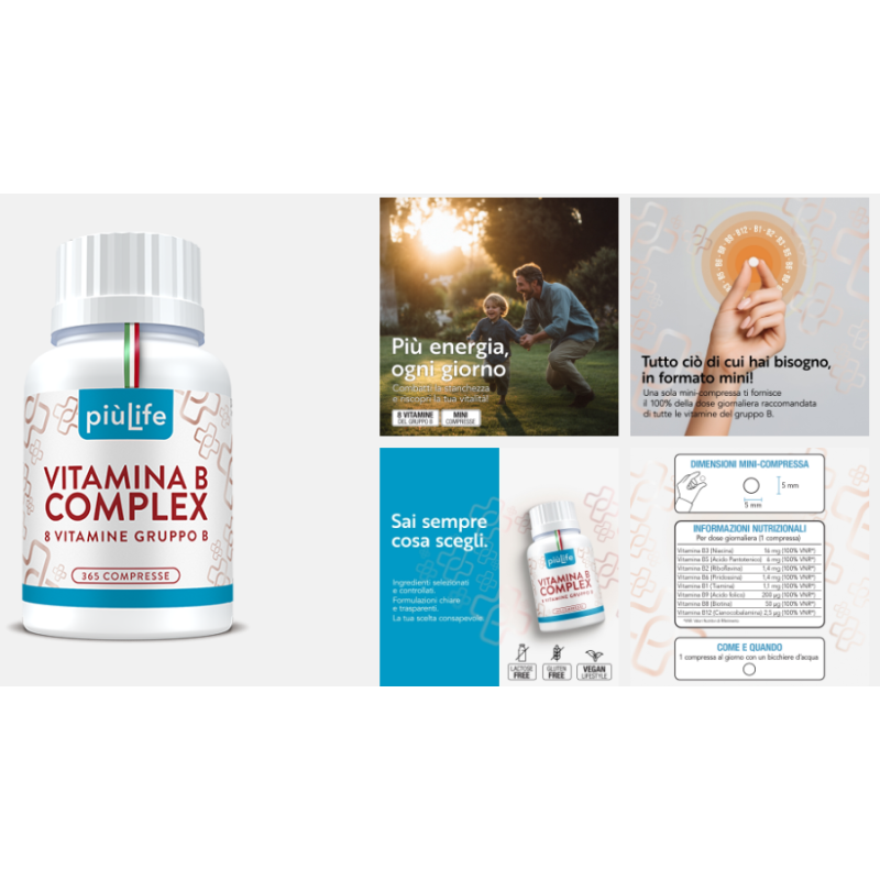 Prezzo 21,60 €La maggior parte delle vitamine del gruppo B è termolabile e fotosensibile. Infatti, la cottura e la conservazione degli alimenti riducono molto il contenuto vitaminico complessivo che pensiamo di assumere. +LIFE ti fornisce il 100% del fabbisogno giornaliero di ogni vitamina B, in una semplice compressa!